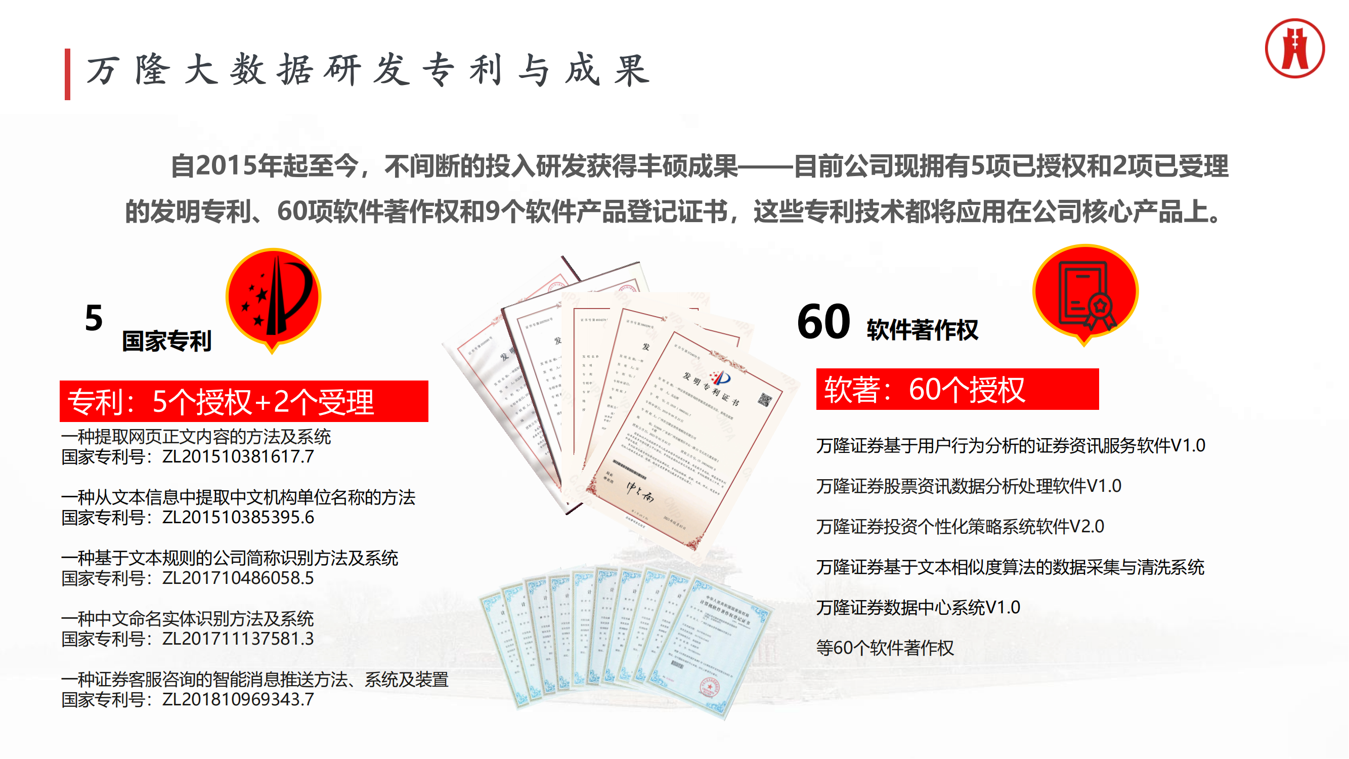 ?万隆大数据拥有5个国家发明专利+60项软件著作权