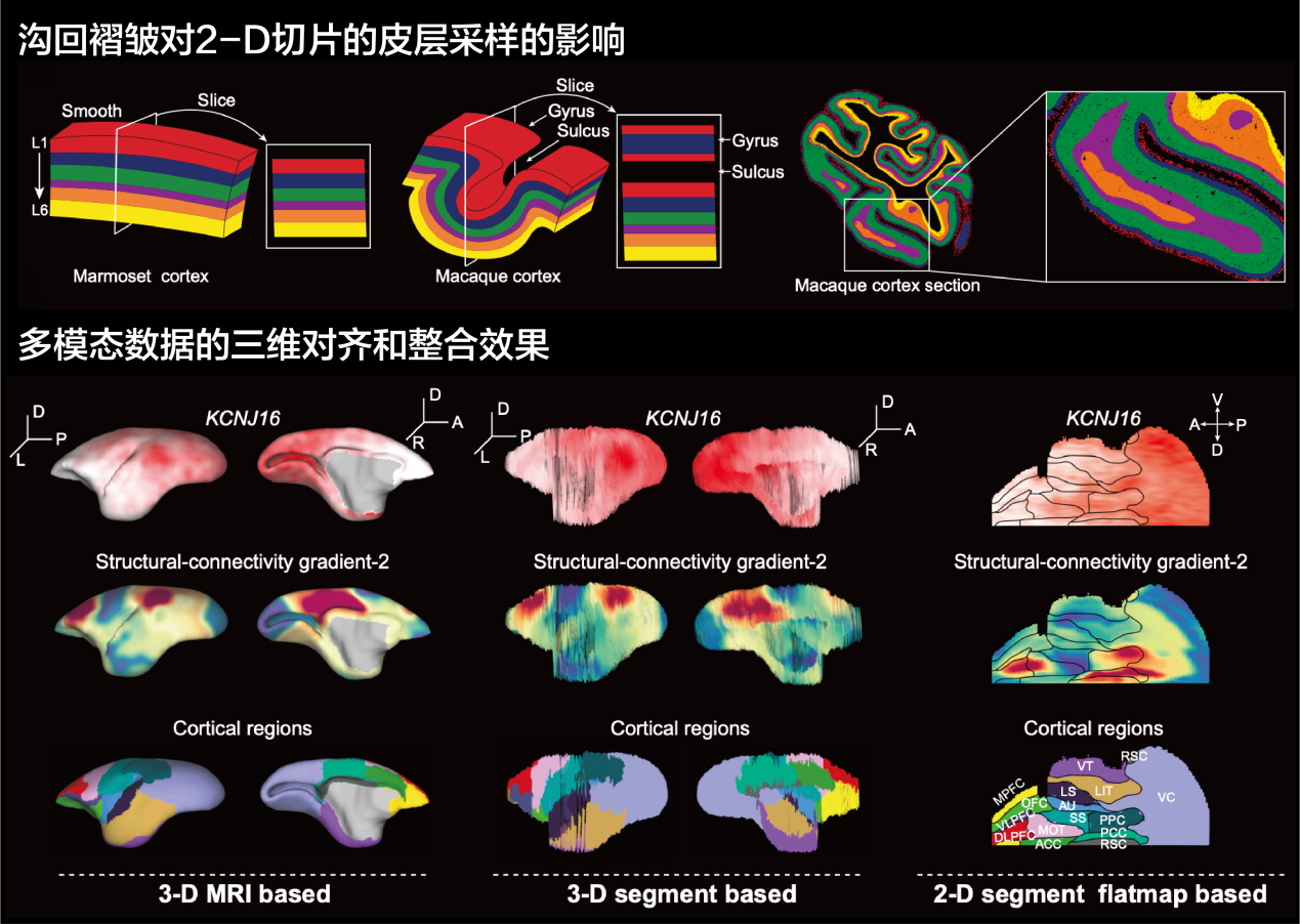要全景式解析灵长类大脑的组织原则,须将微观的基因表达信息与宏观的神经连接数据进行整合。然而,传统研究面临着巨大的技术挑战:灵长类大脑体积巨大且皮层高度折叠(沟回),一方面,复杂的沟回导致二维切片往往难以垂直于皮层表面切割,从而无法完整采样皮层所有的层状结构;另一方面,这也极大地增加了二维切片数据进行三维重建、跨模态配准以及全脑可视化分析的难度。