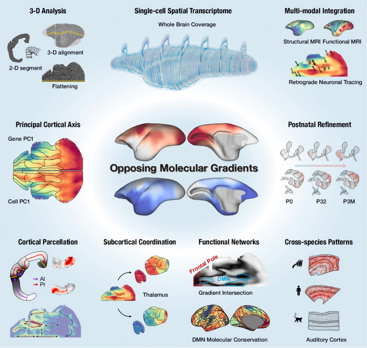 2026年4月17日,中国科学院脑科学与智能技术卓越创新中心刘赐融研究组和孙怡迪研究组、杭州华大生命科学研究院副研究员郝世杰、澳大利亚莫纳什大学教授马塞洛·罗萨(Marcello Rosa )团队合作,在Science期刊发表《An opposing molecular gradient axis underlies primate cortical organization》的研究论文。该研究整合空间转录组学、磁共振成像与逆向神经示踪等多模态技术,发现皮层中存在两个起源相反、方向对立的分子梯度,该梯度分别以初级感觉皮层和古/异皮层为锚点,在出生后发育过程中逐渐精细化,不仅刻画了灵长类大脑皮层细胞组成和功能网络的空间架构,还与丘脑的基因表达及丘脑-皮层投射模式高度协同, 这一发现为长期以来关于大脑皮层扩张与组织起源的学术争论提供了新的整合性解释。