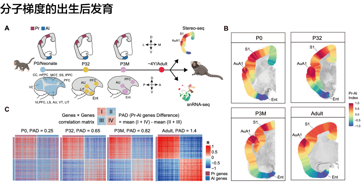 进一步发育分析显示,Pr-Al分子梯度轴并非在成年期才突然出现,而是作为一种先天的“原始蓝图”,在出生时(P0)即已存在雏形。在出生后的发育过程中,该梯度经历了一个显著的“精细化”过程。随着大脑的发育,Pr与Al两极的分子特征差异显著增强,原本相对弥散的基因表达模式逐渐“锐化”,形成了成年期界限分明的分布格局。这一发现表明,灵长类皮层的组织原则是由先天遗传程序设立初始框架,并通过后天的神经发育与潜在的感觉经验输入共同塑造,最终完成了皮层区域的功能特化。
